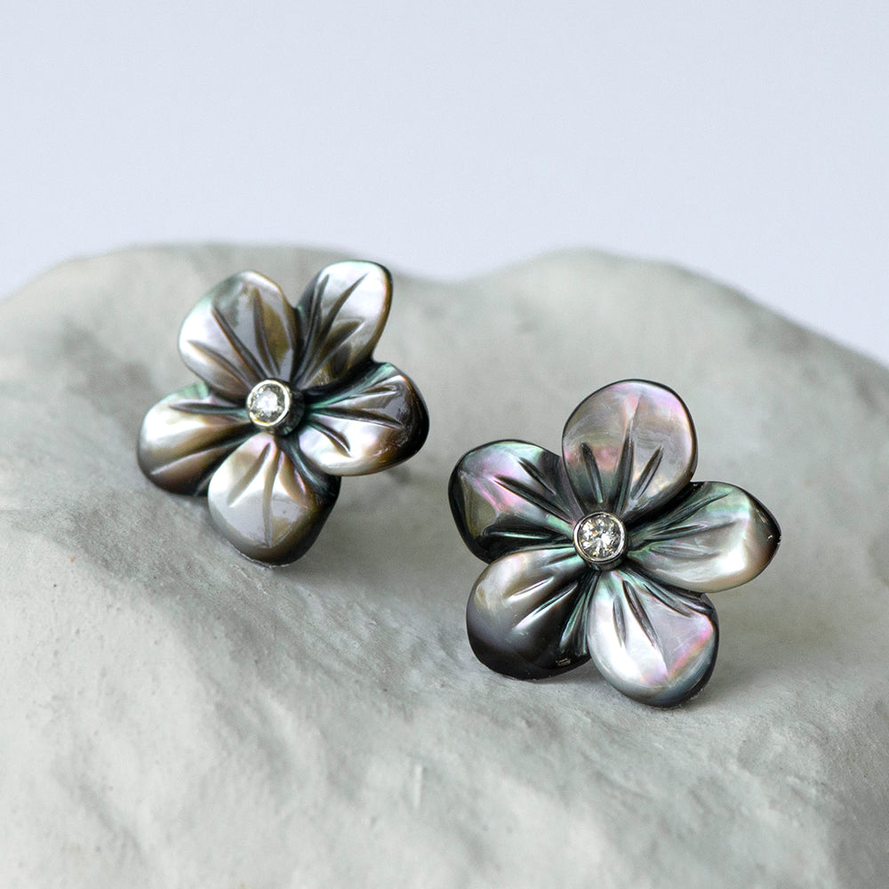 Hand-carved floral motif ear studs, Tahitian grey Mother-of-Pearl, approximate 14mm at the widest point measured.