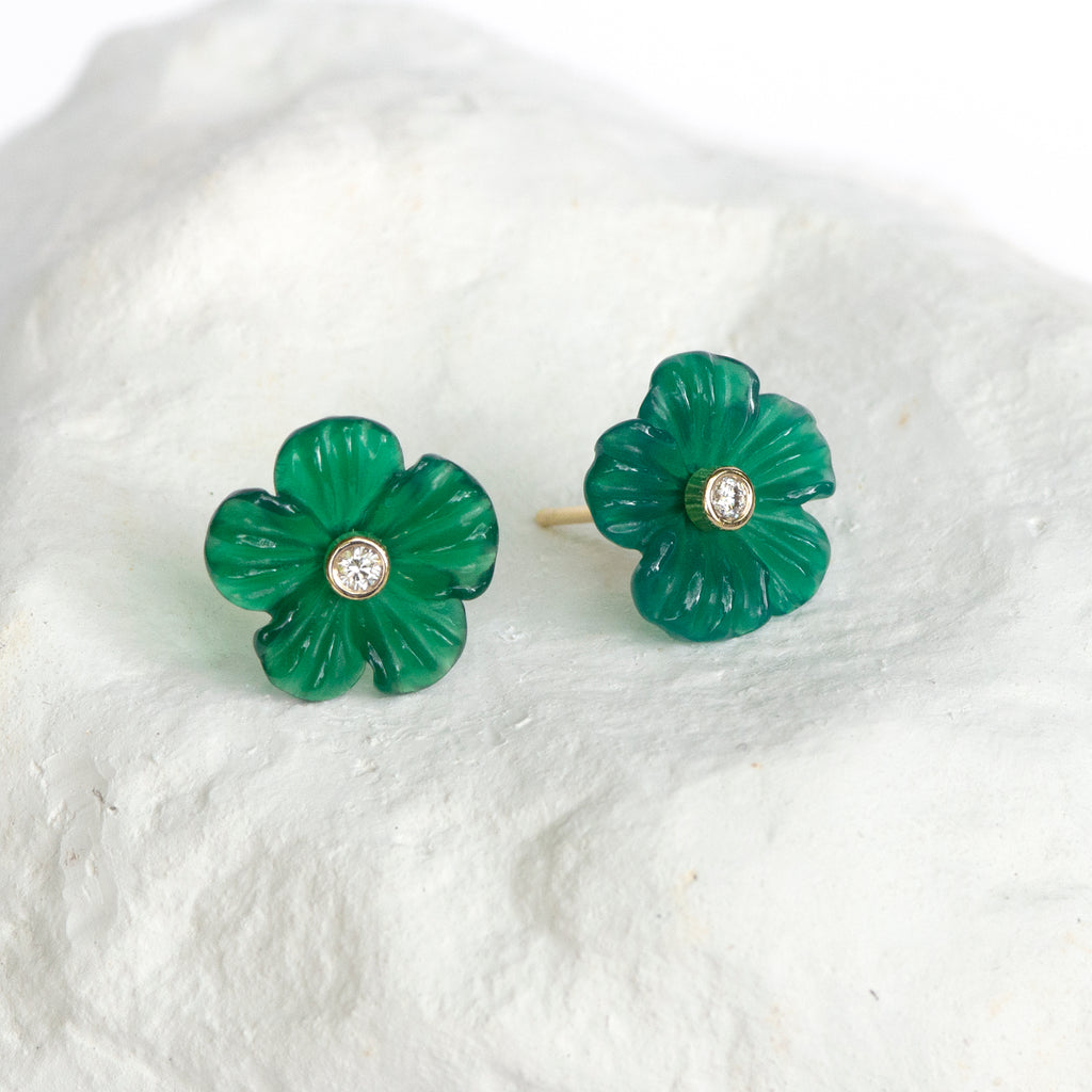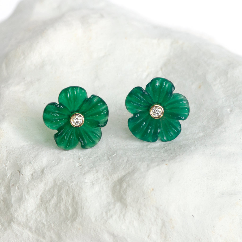 Cute Buttercup Floral motif earrings carved out of dyed green Agate, measured 12mm at the widest point,