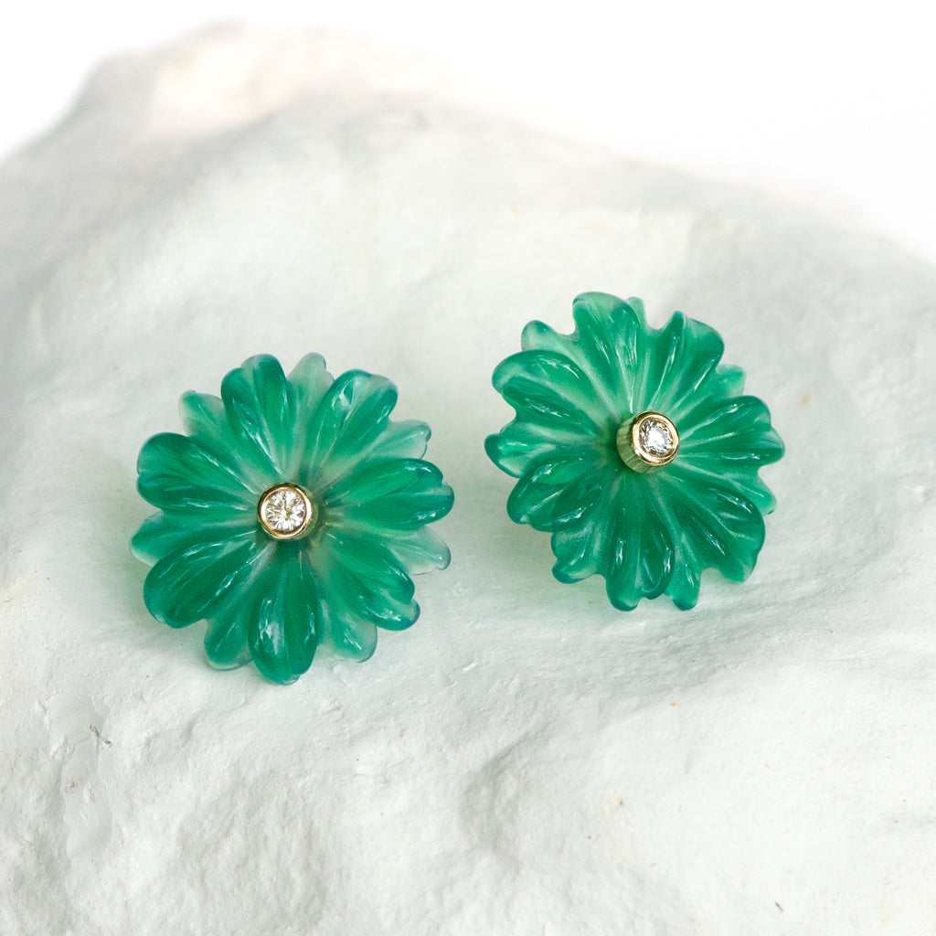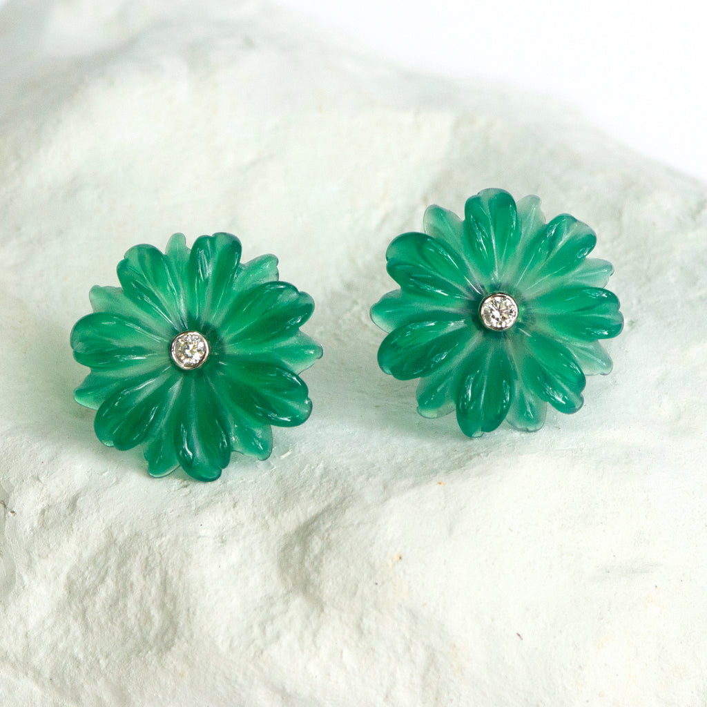 Daisy flower earrings carved out of dyed green Agate, measured 16mm at the widest point,