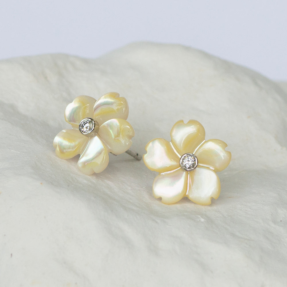 Light creamy yellow flower earrings mother of pearl with diamonds in yellow gold